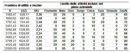 Le attività disponibili di un portafoglio produttivo dell’azienda agricola vengono combinate tenuto conto del livello di reddito e della loro variabilità. La funzione di utilità Sumex consente di affrontare il problema della ricerca del piano produttivo ottimale, modulando il grado di avversione al rischio. Essendo la funzione di utilità non lineare, viene adottata una approssimazione lineare che consente di semplificare la ricerca della soluzione ottimale senza perdere di generalità e precisione. Una combinazione ottimale di portafoglio è data da una soluzione di angolo che individua un punto della curva di indifferenza; variando parametricamente il coefficiente di rischio lambda in un intervallo assegnato compreso fra 1 (valore minimo) e b (valore massimo) si ottengono i valori delle soluzioni d'angolo ottimali che consentono di costruire la frontiera efficiente.3. Il calcolo è svolto col metodo Motad che genera la frontiera media-varianza tramite la combinazione efficiente di attività produttive delle quali si conoscono la distribuzione probabilistica dei redditi (vedi stati di natura della Tabella 2 i cui payoff sono rappresentati dalle deviazioni positive e negative dei redditi lordi agricoli) (Hazell 1971; Anderson et al., 2002). Queste probabilità vengono rilevate in modo molto semplice assumendo che ogni stato abbia una uguale probabilità di verificarsi e che il campione rilevato sia rappresentativo (Patten et al., 1988). Nella prima parte della tabella compaiono le soluzioni che usano una minor quantità di Sau, nella seconda parte sono riportate le soluzioni con maggior consumo di Sau. Questo risultato suggerisce che la minor avversione al rischio determina un aumento della Sau utilizzata ovvero il passaggio da una soluzione di break even (sopravvivenza a profitto nullo) a soluzioni di profitto progressivamente crescente. Una seconda osservazione riguarda la differenziazione produttiva frequentemente considerata per spalmare il rischio fra più produzioni: la monocoltura mais (vedi riga 10) raggiunge il livello più elevato di utilità (4200) ai più elevati livelli di rischio (rapporto R/U = 2,86) con il consumo dell’85% della Sau. La combinazione a minor rischio (vedi riga 5) include nel piano produttivo tre colture: Frumento (20%), Mais (40%) e Soia (4%) ed un uso della Sau pari al 64% del totale ed un valore R/U pari a 2,31. La soluzione che consente il massimo utilizzo di Sau è riportata in riga 9 e prevede l’inserimento delle seguenti attività: Mais (40%), Frumento (20%), Orzo (20%), Colza (2%), Soia (10%), Girasole (7%) ed ha un rapporto R/U fra i più bassi. Il valore più basso della funzione obiettivo è riportato nella riga 2 con un uso della Sau limitata al 52%, ed un piano aziendale composto di sole tre attività delle quali il mais rappresenta il 40% del totale la colza il 10% e l’orzo il 2% ed un valore del rapporto R/U pari a 2,46. La soluzione maggiormente diversificata è riportata nella settima linea con l'uso della Sau pari al 98%, sette attività incluse nel piano produttivo di cui il mais rappresenta il 30%, il frumento il 20%, l’orzo il 20%, il sorgo il 10% la colza il 10% la soia il 10% e il girasole il 10%, ed un rapporto R/U = 2,53 che possiamo definire di livello medio.