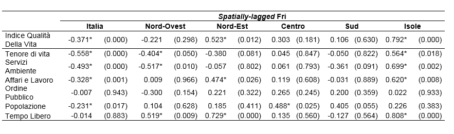 Rispetto alle tradizionali analisi esplorative di tipo spaziale (Moran, 1950), si è qui preferito mettere in relazione la qualità della vita osservata in una provincia con il grado di ruralità delle province limitrofe, testando così la presenza di spillover territoriali, legati alla presenza di aree urbane o aree rurali. Per ogni provincia italiana, dunque, è stato calcolato uno spatially-lagged Fri, ovvero il valore medio dell’indicatore Fri per l’insieme delle province vicine. Per province ‘vicine’ si fa qui riferimento a province che condividono un tratto di confine amministrativo (Anselin, 1988).