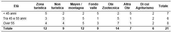 Complessivamente sono state intervistati 21 conduttori (8 aziende condotte da donne) e 25 familiari, questi ultimi suddivisi tra 13 coniugi e 12 figli.