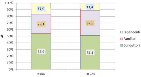 Passando ad analizzare il capitale umano, si riscontra che in Italia, all’interno delle aziende individuali e familiari, il conduttore assicura il 53,9% del carico di lavoro, misurato in Awu, i componenti della sua famiglia il 29,1% e i dipendenti non familiari il 17%. La quota di quest’ultima tipologia di manodopera risulta maggiore nel nostro Paese rispetto alla media comunitaria, dove ha un peso più grande la componente familiare (Figura 5).