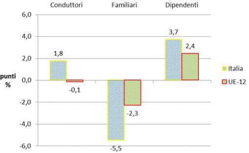 Il primo elemento che emerge da questo studio è che sia in Italia che in Europa, la tradizionale immagine di un’agricoltura basata su piccole aziende, con coltivazioni ed allevamenti, condotte da un capo famiglia con l’aiuto della moglie e dei figli è sorprendentemente ancora valida ai giorni nostri anche se la dimensione media aziendale è cresciuta sensibilmente rispetto al passato.