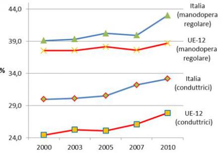 Figura 7 - Composizione % della manodopera femminile sul totale, per tipo (conduttrici e manodopera regolare) nel periodo 2000-2010