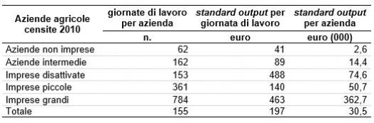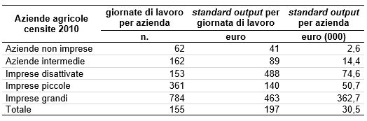 Ciò che comunque valida maggiormente l’associazione tra piccola impresa e agricoltura familiare e tra grande impresa e agricoltura capitalistica è il confronto tra le produttività giornaliere del lavoro: 140 euro/giornata nel primo caso e ben 460 euro/giornata nel secondo. Un divario certamente condizionato anche dal fatto che al censimento possono essere stati sottaciuti dei lavoratori dipendenti, specie se occasionali, assunti in modo irregolare, ma tale comunque da suggerire la considerazione che mentre nel primo caso l’obiettivo prevalente sia quello di valorizzare una disponibilità di lavoro abbondante rispetto agli altri fattori (terra e capitale), stante la dimensione economica contenuta dell’impresa, con relativamente poche e scarsamente remunerative alternative occupazionali (quindi con prezzo ombra basso). Nel secondo caso, invece, in cui la dimensione economica e quindi anche la disponibilità di capitali è meno costringente e il lavoro reperito all’esterno ha costi unitari relativamente maggiori, prevale una selezione di ordinamenti produttivi risparmiatori di lavoro, ad alta ed altissima intensità degli altri fattori (capitale, terra, servizi agro-meccanici) tale da elevare notevolmente la produttività del lavoro.