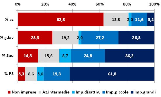 La figura fornisce un’immagine dell’agricoltura italiana decisamente polarizzata. Da un lato, quasi due terzi delle “aziende non imprese” censite (1.018.496 unità, pari al 62,8%) impiega un quarto delle giornate di lavoro (25,2%), coltiva il 14,8% della Sau e produce soltanto il 5,3% della PS complessiva. Dall’altro lato, sommando assieme tutte le imprese, queste rappresentano meno di un quinto (18,8%) delle aziende censite. Con il 55,3% delle giornate di lavoro e il 69,7% della Sau, forniscono l’85,9% di tutta la PS (61,8% dovuto al solo 5,2% delle aziende agricole grandi imprese). Restano le aziende intermedie. Se si osserva che queste, pur essendo il 18,3%, impiegano il 19,2% di tutte le giornate di lavoro e il 15,6% della Sau, ma producono soltanto l’8,6% della PS, si può concludere che la loro natura è più simile a quella delle non-imprese che delle imprese.