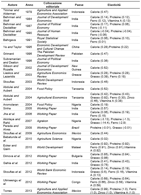 La letteratura sull'elasticità al reddito di calorie e nutrienti è ampia, ed evidenzia una grande eterogeneità delle stime dovute a differenze nei disegni di ricerca, o dinamiche temporali e spaziali. Molti fattori tendono ad influenzare le stime empiriche di elasticità al reddito nel consumo di nutrienti: nel presente articolo rivedrò sistematicamente l'elasticità al reddito di calorie, macronutrienti e micronutrienti. In particolare, ho considerato un cospicuo numero di stime sull'elasticità al reddito di calorie, proteine, grassi, zinco, ferro e vitamina A. L'analisi include studi condotti nei paesi sviluppati e in quelli in via di sviluppo. Sebbene recenti studi abbiano evidenziato quale sia l'elasticità al reddito nel consumo di calorie (ad esempio Ogundari e Abdulai, 2013), non vi sono recensioni che esaminino, su base comparativa, le elasticità al reddito di calorie, micronutrienti e micronutrienti. Lo studio presenta altresì riflessioni sulle determinanti della eterogeneità delle stime per mezzo di un rigoroso approccio econometrico: la meta-analisi. Quanto evidenziato nel presente articolo è rilevante per il dibattito in corso sulla sicurezza alimentare.