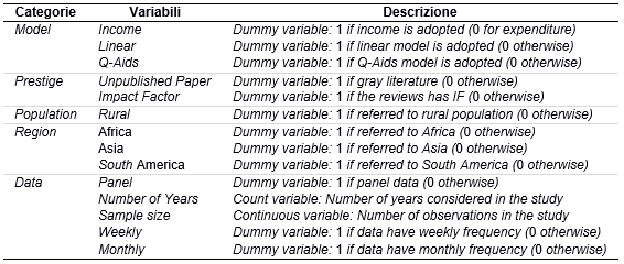 L'insieme di regressori (Tabella 2) include le variabili “Income”, “Linear”, “Q-Aids”, and “Number of Years”, “Panel”, “Weekly”, “Monthly”, “Rural”, “Africa”, “Asia”, “South America”, “Unpublished Paper”, and “Impact Factor”: le prime tre variabili si riferiscono al tipo di modello econometrico utilizzato nei lavori scientifici; la variabile “Number of Years” si riferisce al numero di anni considerati nelle analisi scientifiche; la variabile “Panel” si riferisce all’utilizzo di dati raccolti per diversi anni; le variabili “Weekly” e “Monthly” fanno riferimento alla frequenza dei dati; “Rural” assume valore pari ad uno se l’analisi è stata condotta su dati relative alla popolazione rurale; “Africa”, “Asia” e “South America” indicano la regione cui si riferiscono i dati; “Unpublished Paper” e “Impact Factor” indicano, rispettivamente, se il lavoro scientifico non è stato pubblicato, ovvero se è stato pubblicato su rivista con impact factor.