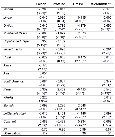 La tabella 4 presenta ulteriori stime che rafforzano i risultati precedenti e ne mostrano di ulteriori: quando si adotta il reddito familiare, piuttosto che la spesa alimentare, per stimare l'elasticità al reddito per le calorie, si ottengono valori notevolmente inferiori; adottando un modello Q-Aids i valori stimati di elasticità tendono ad essere più elevati. I risultati forniscono anche una spiegazione sul tipo di bias di pubblicazione: l'elasticità al reddito riportata in articoli pubblicati su riviste è generalmente più bassa di quella riportata nei documenti di lavoro; l'elasticità è altresì inferiore per gli articoli pubblicati su riviste con impact factor. Dunque, maggiore il prestigio dello studio, minore l'elasticità. Le variabili "Rural" e "Continent" sono statisticamente significative, seppur mostrino effetto trascurabile. I risultati sulla qualità dei dati sono molto interessanti: quasi in tutti i casi è stato riscontrato che a lavori con informazioni dettagliate corrispondono valori più alti di elasticità. Ad esempio, l'utilizzo di dati panel è correlato a valori più alti di elasticità al reddito. Analogamente, laddove siano stati adottati dati ad alta frequenza (ad esempio dati mensili o settimanali) le stime ottenute sono più elevate. Infine, I lavori con elevata dimensione campionaria tendono a fornire stime più grandi o inferiori, a seconda del nutriente considerato: elasticità maggiore per proteine e microelementi, ed inferiore per il grasso.