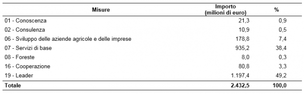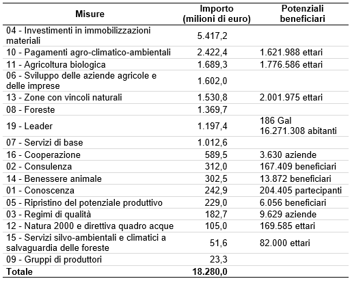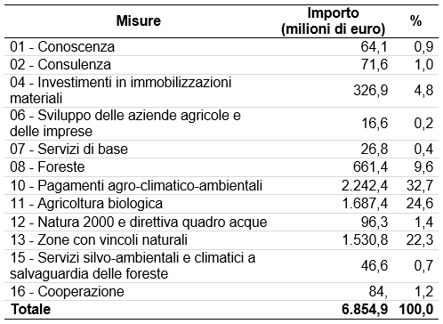 Le misure applicate da tutti e 21 i Psr regionali (quindi escludendo il Psr nazionale relativo, lo ricordiamo, a gestione del rischio, biodiversità e risorse idriche) sono: misura 1 - trasferimento di conoscenze e azioni di informazione, misura 4 - investimenti in immobilizzazioni materiali, misura 6 - sviluppo delle aziende agricole e delle imprese, misura 7 - servizi di base e rinnovamento dei villaggi nelle zone rurali, misura 8 - investimento nello sviluppo delle aree forestali e nel miglioramento della redditività delle foreste, misura 10 - pagamenti agro-climatico-ambientali, misura 11 - agricoltura biologica, misura 16 - cooperazione e, infine, misura 19 - sostegno allo sviluppo locale di tipo partecipativo nell’ambito del Leader. Seguono, in termini di diffusione territoriale, la misura di sostegno alle zone soggette a vincoli naturali (misura 13), applicata da tutte le regioni tranne che dalla Puglia, la misura di servizi di consulenza (misura 2), non applicata solo da Bolzano e Valle d’Aosta, e la misura in favore dei regimi di qualità dei prodotti agricoli e alimentari (misura 3), non applicata solo da Bolzano e Trento.