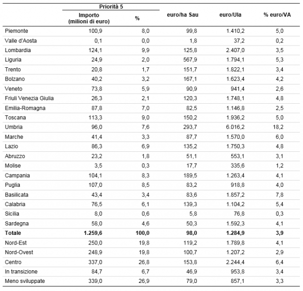 Priorità 5 - Infine, nell’ambito della priorità 5, quella con la minore dotazione finanziaria e destinata a incentivare l’uso efficiente delle risorse e il passaggio a un’economia a basse emissioni di carbonio, le regioni più importanti sono la Lombardia (124 milioni di euro, pari al 10% del totale) e la Toscana (113 milioni di euro, pari al 9%). Ancora una volta la Liguria spicca in termini di dotazione per unità di terra e l’Umbria per unità di lavoro e valore aggiunto.