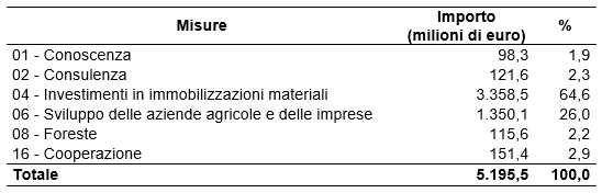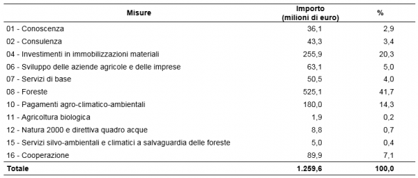 La misura con la maggiore dotazione finanziaria è la 8 - Foreste, che copre poco meno del 42% del totale (525 milioni di euro).