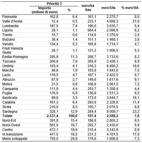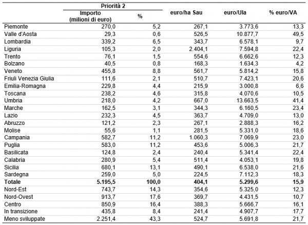 Priorità 2 - Le regioni che hanno dedicato le maggiori risorse alla priorità 2, quella sulla competitività, coprendo il 44% del totale, sono, nell’ordine, Sicilia (680 milioni di euro), Puglia e Campania (583 milioni di euro, ciascuna), Veneto (456 milioni di euro). In termini relativi, la maggiore dotazione per ettaro di Sau spetta a Liguria e Campania, con valori notevolmente superiori alla media nazionale. In termini di importi per Ula il primato spetta a Umbria e Valle d’Aosta che sono anche quelle con la dotazione più importante rispetto al valore aggiunto regionale.
