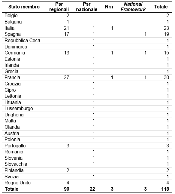 Nel caso dell’Italia, nonostante la numerosità dei programmi territoriali, non esiste un National Framework. La rilevanza delle misure e la loro diffusione territoriale può essere desunta solo guardando ai singoli Psr.