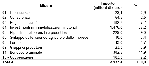 Facendo riferimento alle sole misure attuate nei Psr regionali, le somme disponibili sono poco meno di 18,3 miliardi di euro. La misura 4 - “investimenti in immobilizzazioni materiali” con 5,4 miliardi di euro (pari al 30% del totale) è quella che ha ricevuto la maggiore dotazione finanziaria. Segue la misura 10 - “pagamenti agro-climatico-ambientali” con 2,4 miliardi di euro e un peso del 13%. Questa misura, secondo quanto comunicato dalle regioni nelle tabelle relative agli indicatori di output, dovrebbe potenzialmente riguardare poco più di 1,6 milioni di ettari. I fondi per l’agricoltura biologica, potenzialmente destinati a poco meno di 1,8 milioni di ettari, ammontano a 1,7 miliardi di euro, il 9% del totale. Segue a pochissima distanza la misura 6 - “sviluppo delle aziende agricole e delle imprese” con 1,6 miliardi di euro.