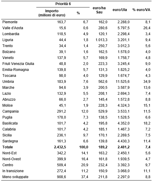 Priorità 6 - Sicilia e Campania sono le regioni più importanti in termini di fondi allocati all’interno della priorità 6, con complessivi 527 milioni di euro, il 22% delle risorse destinata a tale priorità. Ancora una volta la Liguria spicca come regione con la maggiore dotazione per ettaro di Sau e l’Umbria come la regione con la maggiore dotazione per Ula e in rapporto al valore aggiunto. Poco meno del 90% dei fondi relativi alla priorità 6 ricade in due sole misure: la misura 19 destinata allo sviluppo locale di tipo partecipativo (Leader) e la misura 7 relativa ai servizi di base.