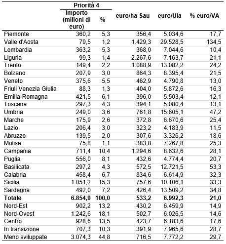 Priorità 4 - Le regioni che hanno dedicato le maggiori risorse alla Priorità 4, vale a dire alla protezione, al ripristino e alla preservazione degli ecosistemi, sono la Sicilia, con oltre un miliardo di euro, pari al 15% del totale, e la Campania, con 711 milioni di euro, il 10% del totale. In termini relativi, è la Liguria a presentare la maggiore dotazione ad ettaro (oltre 2.000 euro), seguita da Valle d’Aosta, Campania e Trento; Valle d’Aosta, Umbria, Sardegna, Trento, Basilicata e Sicilia presentano la maggiore dotazione per unità di lavoro; la Valle d’Aosta è ancora una volta la regione con la maggiore dotazione rispetto al valore aggiunto.