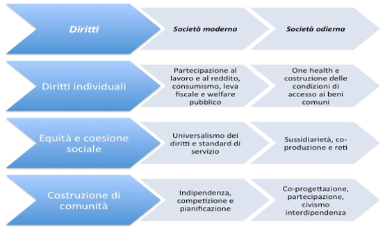 Alle tre aree (Figura 2) la società fordista ha risposto tramite: la diffusione di processi di innovazione tecnologica; lo sviluppo del settore industriale e dei servizi e il potenziamento del ruolo dei mercati a supporto dello sviluppo economico; la diffusione del potenziale di consumo e di benessere nella società; la sottoscrizione dei patti nazionali e di fedeltà fiscale che consentivano diffusione e accesso ai servizi universalistici dei sistemi di welfare. L’agire individuale e l’indipendenza nei comportamenti quotidiani, al contrario, trovava una mediazione collettiva nell’esercizio della democrazia e nella costruzione delle politiche (dalla pianificazione urbana e del territorio fino a quelle dell’educazione). A livello locale, specie in ambito urbano, lo spirito di comunità lasciava spazio alla costruzione di un’identità collettiva legata a un’idea locale di sviluppo delle grandi città (la Torino industriale, la Milano economica, etc), o alla ragionevolezza del benessere borghese della provincia. Il ridursi delle leve pubbliche e l’accrescersi delle questioni sociali e ambientali odierne trovano gli attori - pubblici e privati - impegnati nella definizione di nuove strategie e soluzioni per il benessere individuale e locale.
