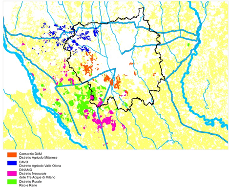 Regione Lombardia ha promosso, inoltre, l'istituzione di distretti agricoli (con LR 23 Gennaio 2007 "Strumenti di competitività per le imprese e per il territorio della Lombardia") a sostegno della creazione di reti tra imprese agricole e di una produzione di qualità, con lo specifico obiettivo della conservazione dell'identità del paesaggio lombardo come marchio di qualità dei prodotti alimentari e come risorsa culturale. I distretti agricoli lombardi sono oggi ventidue, dei quali quattro interessano strettamente l’area metropolitana milanese: il Distretto neorurale delle tre acque di Milano Dinamo, il Distretto Agricolo Milanese Dam, il Distretto Riso e Rane, il Distretto agricolo del Fiume Olona Davo (Figura 2).