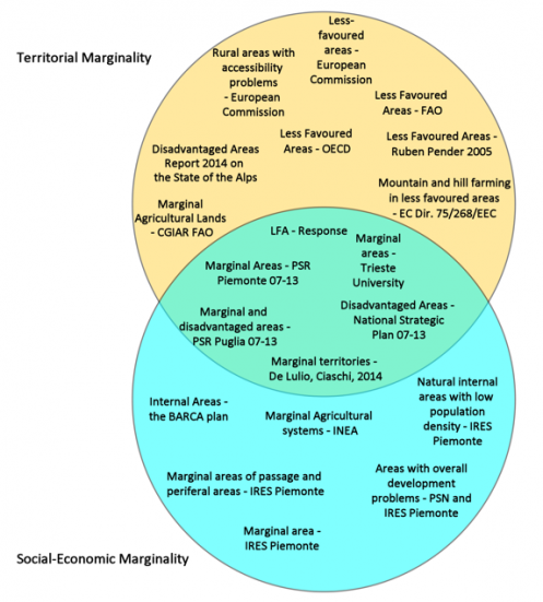 In a country like Italy, which is extremely diversified and predominantly mountainous or hilly, the protection and promotion of rural areas is crucial for their survival. These areas are often characterized by "marginality" or a complex set of disadvantages, due not only to unfavourable physical characteristics of the landscape, but today also to socio-economic and relational aspects, following the evolution over the past two decades of definitions provided by important organizations and institutions that deal with the issue at a national and international level (Figure 6).