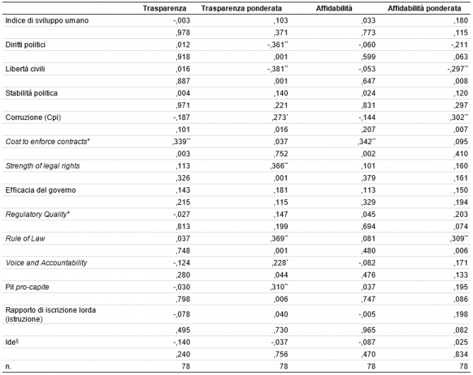 Tabella 2 - Analisi di correlazione: principali risultati per trasparenza e affidabilità