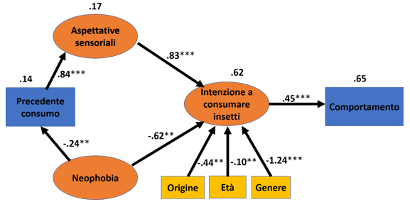 Il modello (Figura 1) è significativo e spiega il 65% della varianza complessiva del comportamento ed il 62% della varianza dell'intenzione (valori R2). Il comportamento è significativamente correlato all’intenzione a mangiare i prodotti a base di insetti (r = .58; p <0.001). Mentre l’intenzione è influenzata maggiormente dalle aspettative sensoriali (r = .83; p <0.001) rispetto alla Food Neophobia (r = -.62, p <0.01).