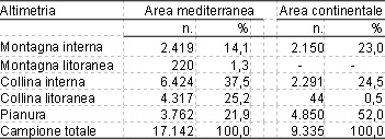 Il campione è stato successivamente stratificato in base all’altimetria e agli ordinamenti produttivi (OTE) (3). Sono state prese in esame quattro classi altimetriche: la montagna (comprende sia la montagna interna sia quella litoranea), la collina interna e quella litoranea, dove è localizzato il maggior numero delle aziende mediterranee, e la pianura dove è presente il 50% delle aziende continentali. Per quanto riguarda gli OTE è stata utilizzata una aggregazione appositamente configurata per evidenziare la specializzazione produttiva delle aziende agricole mediterranee (Cagliero, Henke, 2006).