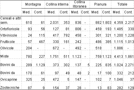Come si evidenzia nella Tabella 3, nella fascia collinare interna dell’area mediterranea sono concentrate le aziende specializzate in seminativi, oltre che le aziende olivicole e le miste, mentre nella collina litoranea si aggiungono anche le ortofloricole e le vitivinicole; le aziende frutticole sono localizzate soprattutto in pianura. Le aziende zootecniche specializzate in ovicaprini e bovini a orientamento latte si distribuiscono prevalentemente nella collina interna e in montagna, mentre quelle specializzate in bovini da carne sono localizzate principalmente in montagna. Nella fascia pianeggiante continentale le aziende più frequenti sono quelle specializzate in seminativi, seguite da quelle miste e dalla zootecnia da latte; queste ultime sono largamente predominanti nella fascia montana, mentre in quella collinare prevalgono la vitivinicoltura e gli ordinamenti misti. Infine, per quanto concerne la frutticoltura, le aree di maggior concentrazione sono la montagna e la pianura.
