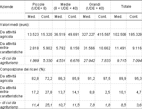 Tabella 6 – Composizione dei ricavi per attività, dimensione economica delle aziende ed area