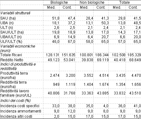 Tabella 7 - Principali variabili strutturali ed economiche delle aziende biologiche e non biologiche