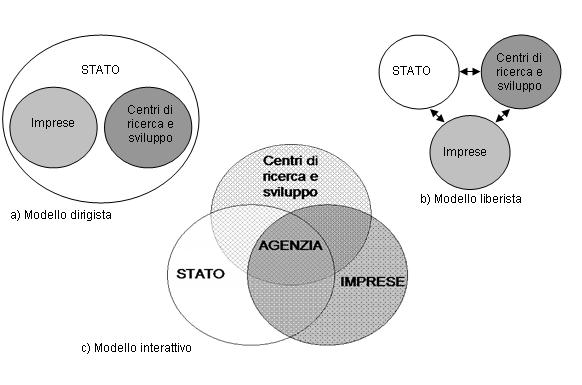 Vi sono tre possibili rappresentazioni. La prima, ove lo Stato incorpora l’università e l'industria e dirige i rapporti fra loro. La versione forte è quella presente nei Paesi dell’Europa orientale, prima del crollo del 1989. Quella debole è riscontrabile nelle politiche di molti Paesi latino-americani e in alcuni europei, come la Norvegia. Una seconda configurazione, opposta alla precedente, vede le tre sfere separate da robusti confini e con rapporti circoscritti tra di loro. Essa è assimilabile ai sistemi innovativi basati su politiche tecnologiche di laissez faire, come la Gran Bretagna, gli Stati Uniti e quei Paesi che sperimentano terapie shock al fine di superare la transizione verso il mercato. La proposta innovativa consiste nella terza tipologia, finalizzata a creare una zona di stretta interazione tra le tre sfere istituzionali. Questa intersezione si concretizza nell’istituzione di organismi “ibridi” (le agenzie), snelli ma con un mandato pieno a coordinare le attività in modo unitario, al fine di favorire l’erogazione di servizi di pubblica utilità per la diffusione dell’innovazione (4).