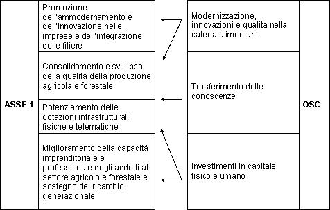 In base agli Osc dello sviluppo rurale, ciascuno Stato membro è chiamato ad elaborare la propria strategia nazionale di sviluppo rurale attraverso la definizione del Piano strategico nazionale (Psn) che costituisce, quindi, il quadro di riferimento per la preparazione dei Programmi di sviluppo rurale (Psr). Il Psn stabilisce difatti che gli interventi dell’Asse 1 vanno articolati secondo delle priorità settoriali e/o tematiche in relazione alle problematiche e ai fabbisogni individuati in ciascun Psr. In particolare, le relazioni individuate tra gli obiettivi dell’Asse e le priorità comunitarie sono identificate dal seguente schema: