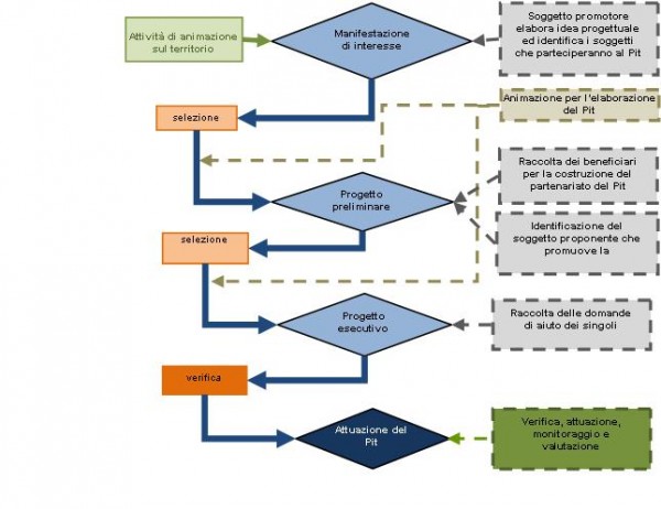 Secondo gli orientamenti stabiliti dal citato decreto, i Pit sono definiti da Province o Comunità montane o da altri soggetti promotori operanti in stretta relazione con gli uffici di tali Enti e concorrono all’assegnazione di punteggi di priorità alle singole domande di aiuto.