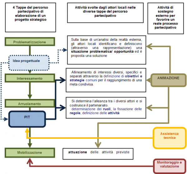 In terzo luogo, è doveroso sottolineare il legame tra la qualità del progetto e la qualità del processo di progettazione, che dovrà essere realmente partecipativo. Gli autori sono consapevoli che dietro la maschera della partecipazione si nascondono, spesso, dinamiche non inclusive e top-down. Comunque, non è imponendo sulla carta delle specifiche metodologie che è possibile risolvere il problema nella sostanza. Secondo gli stessi principi della partecipazione (Bobbio, 2004) è necessario lasciare libertà di percorso agli attori, tuttavia è possibile garantire un certo livello di effettività della partecipazione legando l’approvazione del Pit ad una valutazione del percorso attivato, con riferimento a: (a) le metodologie adottate, che dovranno essere congruenti con le finalità del processo e con il contesto, (b) le iniziative intraprese al fine di favorire l’emersione degli interessi diffusi e normalmente non rappresentati (c) le azioni di informazione e comunicazione. Tale percorso dovrà raggiungere degli standard qualitativi minimi affinché il Pit sia approvato. Infine, un aspetto centrale ma anche problematico, è la modali