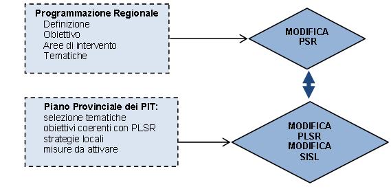 Nella proposta, la fase di programmazione si articola in un momento regionale ed in un momento locale attraverso cui si precisa un Pit, se ne identificano gli obiettivi (in coerenza con gli obiettivi del Psr), le tematiche (agricoltura sociale, biodiversità, sistemazioni territoriali, risparmio ambientale), le risorse (dotazioni finanziarie all’interno del Psr) e le misure da attivare. Il momento regionale interagisce in un processo bidirezionale con la programmazione locale che definisce un Piano provinciale dei Pit (Figura 2).