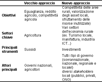 Con l’affermarsi del cosiddetto “new rural paradigm” (Oecd, 2006), l’UE ha progressivamente sviluppato un nuovo approccio “place based” alle politiche agricole, di tipo multisettoriale e territoriale, che affianca le tradizionali politiche di intervento sui mercati con l’obiettivo di identificare e sfruttare le specifiche potenzialità di sviluppo delle singole aree rurali. Il nuovo paradigma dello sviluppo rurale adotta un modello di politica economica per la campagna che impone dei cambiamenti con riferimento agli obiettivi, ai settori di intervento, agli strumenti e agli attori coinvolti (Tabella 1), distinguendosi dal tradizionale “modello agrarista” (De Benedictis, De Filippis, 1998) basato su un intervento pubblico per la campagna finalizzato alla specializzazione dell’ambiente rurale nella produzione di alimenti (Basile, Romano, 2002).