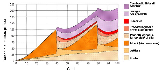 La figura 1 indica le variazioni cumulate degli stock di C nei diversi compartimenti, boschivi ed extraboschivi. Il caso specifico si riferisce a un intervento di afforestazione con prelievo di prodotti legnosi per usi diversi, incluso quello energetico. Con l’affermazione e la crescita della piantagione, aumenta la massa di C nella biomassa viva, nella lettiera e nel suolo. Ipoteticamente, al taglio del soprassuolo dopo un turno di 40 anni, i residui delle utilizzazioni rilasciati in bosco vanno ad aumentare la lettiera, una parte del C estratto dal bosco con i prelievi legnosi si accumula nei prodotti legnosi (con diversi cicli di vita), una parte va a finire in discarica, una parte può essere usata per fini energetici.