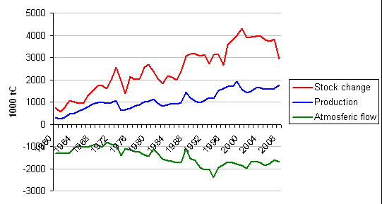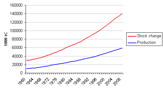 I prodotti legnosi costituiscono quindi uno stock di carbonio, con un ruolo sul ciclo del carbonio e sull’effetto serra. Questo stock extraboschivo aumenterà, agendo pertanto da sink, fino a quando il deperimento e la distruzione per combustione o lo smaltimento in discarica dei vecchi prodotti resterà inferiore alla fabbricazione di nuovi.