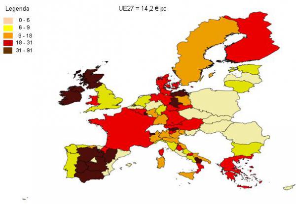 Tra tutti, comunque, il Paese che appare maggiormente frammentato e soprattutto diversificato, senza tendenze precise che caratterizzano un’area dalle altre, è senza dubbio l’Italia, che mostra regioni appartenenti a cinque delle complessive sei fasce individuate rispetto alla spesa per chilometro quadrato. Una ancor maggiore eterogeneità del contesto italiano si osserva nella cartina che riporta la distribuzione della spesa per abitante, tanto che si passa dal Lazio, con 5,1 euro per persona, alla Valle d’Aosta, con una somma a disposizione per persona di 43,6 euro.