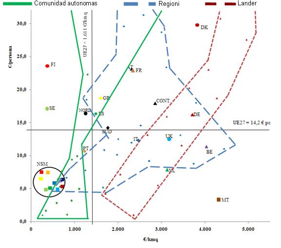 Anche la Spagna mostra una certa compattezza, con una dotazione supplementare per chilometro quadrato che oscilla per quasi tutte le sue regioni tra 588 e 1.983 euro; ad eccezione dell’Andalusia e Rioja, che hanno un budget per unità territoriale superiore, e delle isole (Baleari e Canarie) e della regione di Valencia, che appartengono alla fascia più bassa.