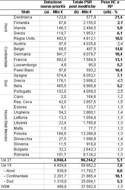 Osservando la distribuzione delle risorse aggiuntive tra gli Stati Membri, dalla tabella 1 emerge chiaramente la limitatezza delle risorse previste per le nuove priorità rispetto al volume finanziario del secondo pilastro. Infatti, l’articolata operazione amministrativa di modifica dei programmi alla luce delle nuove priorità si traduce, in termini di risorse, in appena il 5% del totale dei fondi europei per lo sviluppo rurale.