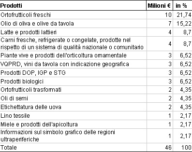 Il bilancio indicativo annuale, che si aggira intorno a 46 milioni di euro, attribuisce al settore ortofrutticolo e al settore oleario e olivicolo il 37% circa del bilancio annuo complessivo (Tabella 1).