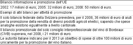 L'importo di 60,5 milioni di euro è stato previsto per la promozione dei prodotti francesi, spagnoli e italiani nel mercato interno, in accordo al Reg. (CE) 1071/2005, e di quasi 19 milioni di euro per la promozione nei Paesi terzi, secondo il Reg. (CE) 1346/2005. Dall'inizio del 2008, il sostegno all’informazione e alla promozione è regolato dal Reg. (CE) 501/2008, sia per il mercato interno sia esterno, in accordo al quale sono stati assegnati 20,6 milioni di euro ai Paesi oggetto di indagine, nel biennio 2008-2009.