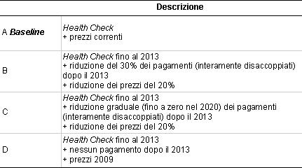 Sono stati sviluppati quattro diversi scenari: uno scenario di baseline (Scenario A, che rappresenta la PAC al momento dello studio, comprese le riforme introdotte dall’Health Check, e le altre misure già programmate, compreso il “soft landing” delle quote latte) e tre scenari alternativi (B, C, D) (Tabella 2).