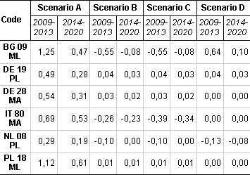 Analogamente al caso precedente, le differenze con lo scenario di baseline sono generalmente negative. Ciò avviene in modo più evidente per gli scenari B e C, caratterizzati da un’ipotesi di riduzione del prezzo, e con più evidenza nel secondo periodo in cui, in tutti i casi, avvengono le variazioni di politica. Casi in cui la differenza di valori marginali è particolarmente forte (es. DE28MA) riflettono le peculiarità iniziali della specifica azienda, caratterizzata da un valore marginale particolarmente alto, piuttosto che del sistema in cui opera.