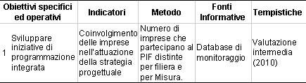 E’ stato predisposto un vero e proprio “piano di valutazione” che introduce una serie di indicatori di performance relativi ai dieci obiettivi specifici e operativi definiti nel PSR del Veneto. Per ogni indicatore, è stato definito il metodo di calcolo, le fonti di informazione utilizzate e la tempistica di sviluppo degli indicatori stessi per lo studio di valutazione nella valutazione intermedia (2010) o nell’aggiornamento previsto per il 2012 e, infine, nella valutazione ex-post (2015) A titolo esemplificativo si riporta lo schema relativo all’obiettivo numero uno (Tabella 1).