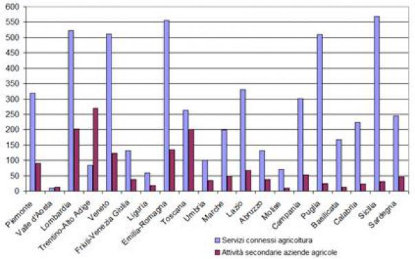 Per quanto riguarda le attività connesse Emilia-Romagna, Lombardia, Veneto, Puglia e Sicilia sono le capofila, mentre per le attività secondarie, con l’agriturismo in primo luogo, troviamo Trentino-Alto Adige, Toscana, Emilia-Romagna, Lombardia e Piemonte.