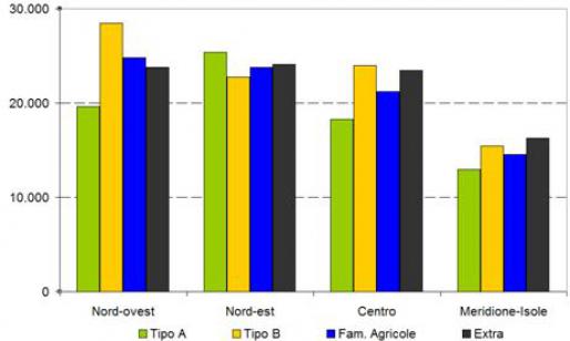 Nella figura 5, per macro aree è possibile verificare le differenze di reddito pro-capite delle famiglie agricole dei diversi tipi (A e B) rispetto al resto delle famiglie (Extra nella figura):