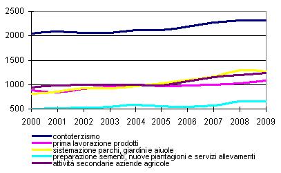 L'insieme di questi due gruppi di attività è in crescita nel tempo in quanto le unità di produzione stanno differenziando la propria attività, dalla produzione alla commercializzazione dei prodotti, alla ricerca di ogni possibile fonte di reddito (ISTAT, 2008). Il grafico in figura 1 mostra l’evoluzione delle principali componenti di attività nell’ultimo decennio: