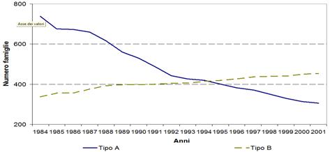Nell’identificazione delle famiglie agricole è anche possibile fare riferimento ad una definizione più ampia che include tutte le famiglie che svolgo attività agricola anche se si tratta di un’attività secondaria (denominate nelle statistiche come famiglie di tipo B) (ISTAT, 1998). Il grafico segente mostra come quest’ultima tipologia di famiglie sia cresciuta in termini numerici nel tempo, in controtendenza rispetto alle famiglie agricole in senso stretto (famiglia ti tipo A):