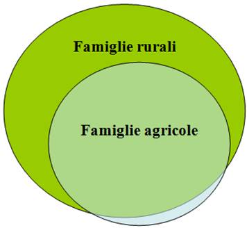 Infine, se si volesse calcolare il reddito delle famiglie rurali accorerebbe tenere presente che queste si sovrappongono a quelle agricole solo in parte, in quanto un loro sottoinsieme non svolge alcuna attività agricola, ne principale ne secondaria, e una parte delle famiglie agricole non vive nelle aree rurali. Il grafico seguente mette in evidenza questa parziale coincidenza dei due insiemi di famiglie: