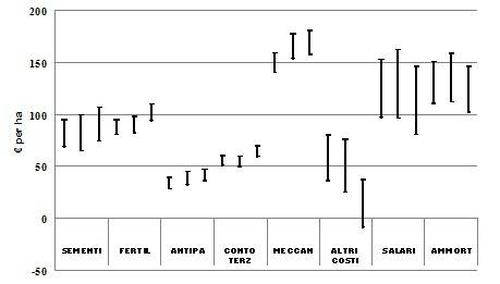 Oltre alla stime del costo medio per ettaro (o per tonnellata nel caso del latte) è stata analizzata anche la variabilità dei risultati ottenuti tramite il calcolo degli intervalli di confidenza per i coefficienti tecnici βik, cioè il valore massimo e minimo tra i quali, con un livello di fiducia del 95%, troviamo il reale valore del coefficiente. Questi valori di minimo e massimo sono stati moltiplicati per il valore medio della produzione per ettaro (o per tonnellata) ottenendo un intervallo di confidenza per i valori monetari.